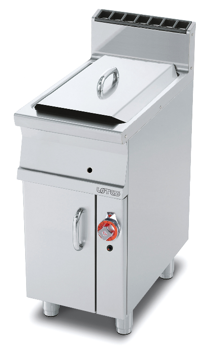 CrNi 18/10 rm. acél kivitel, 1 db 17 l-es medence (33x38x38 cm), főzőolajba merített rm. csőben elhelyezett horizontális égők, gázcsap, biztonsági termoelem, őrláng gyújtás, biztonsági termosztát, 1 db 28x30x12 cm-es műa. nyelű rm. fritukosár, kosárakasztó, olajszűrő, alsó olaj leeresztőcsap, alul ajtóval zárt, állítható lábak.