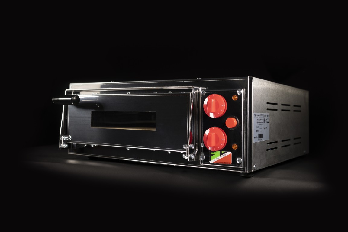 Elektromos fűtésű egyaknás pizzakemence, 1x34-es pizza sütésére alkalmas, rozsdamentes acél burkolat, betekintő ablakkal, formatervezet fogantyúval, rm. lenyitható ajtó, BRAZIL samotlap betéttel, 60-350 C° külön szabályozható, alsó-felső fűtőbetéttel, kamraméret:35×37×7cm Teljesítmény: 1,8 kW / 230V Mérete: 52×60×25 cm