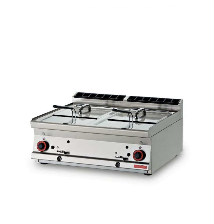 2 db 13 l-es medence, főzőolajba merített r.m. csőben elhelyezett horizontális égők, piezzo gyújtás, biztonsági termosztát, 2 db 21x30x12 cm-es műa. nyelű r.m. fritukosár, kosár akasztó, fronton lévő olaj leeresztőcsapokkal