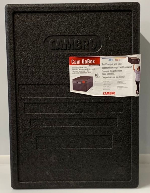 Felültöltős szállító láda, fekete színben, könnyű súly, rugalmas, ellenálló anyag, süllyesztett fülek a könnyű szállításra, belső bemarás az edények mozgatására, OETI engedély, kapacitás: 60x40-es tálcák és dobozok szállítására, anyaga: melegen préselt polipropilén granulátum, származási hely: Németország.