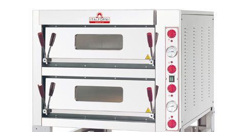 ITALFORNI ektromos fűtésű kétaknás pizzakemence, 2x4db. 32-es pizza sütésére alkalmas, rozsdamentes acél panellel, belső világitással, hőmérséklet mérővel, formatervezet fogantyúval, rm. lenyitható ajtókkal, megfigyelőablakkal, BRAZIL samotlap betéttel, 60-500 C° külön szabályozható alsó-felső fűtőbetéttel kamraméret:66×66×15cm Teljesítmény:9kW/400V Mérete: 91×84×70 cm GARANCIÁVAL, EREDETI OLASZ, JUMO ALKATRÉSZEKKEL