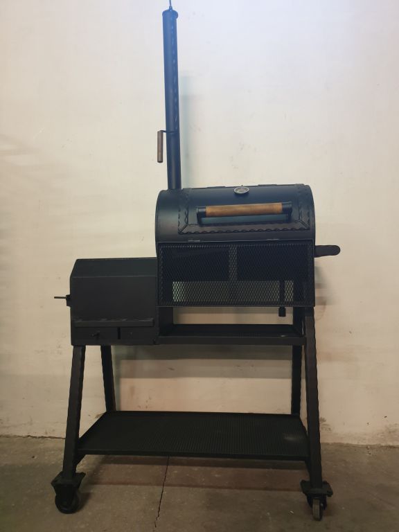 4 mm-es szénacélból készült, belső öntöttvas rácsokkal, hőkijelzővel és kerekekkel ellátva.