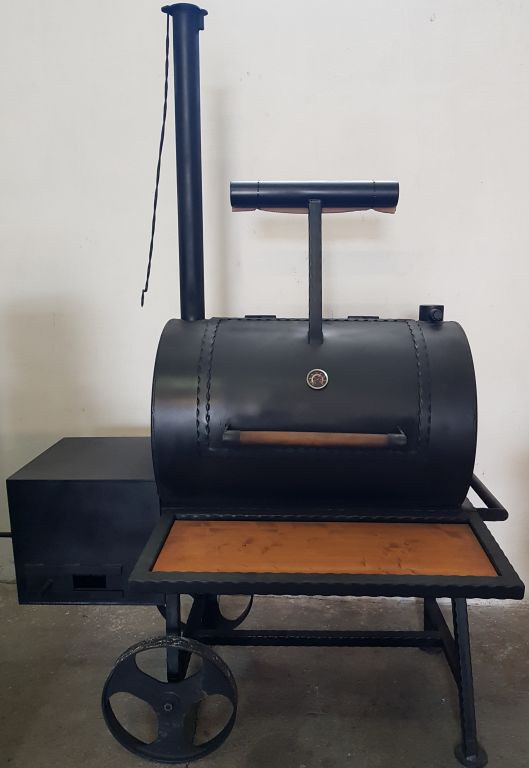 4 mm-es szénacélból készült, belső öntöttvas rácsokkal, hőkijelzővel és kerekekkel ellátva.