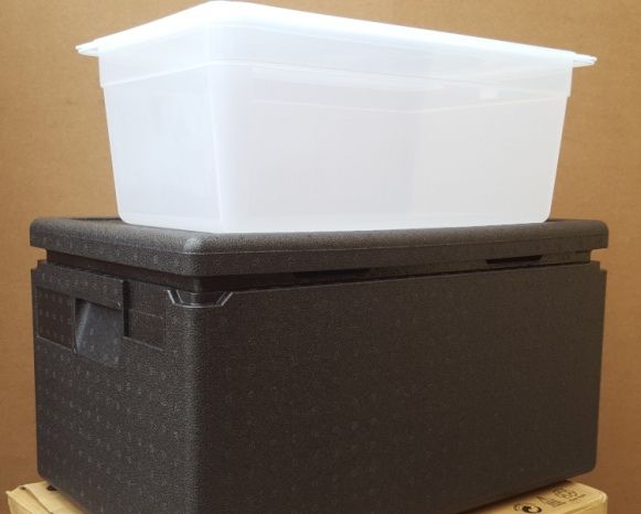 Felültöltős szállító láda, fekete színben, könnyű súly, rugalmas, ellenálló anyag, süllyesztett fülek a könnyű szállításra, belső bemarás az edények mozgatására, OETI engedély, kapacitás: GN1/1 -es tálcák és dobozok szállítására, anyaga: melegen préselt polipropilén granulátum, származási hely: Németország.+ ajándék GN 1/1-200 mm-es polipropilén edény fedővel