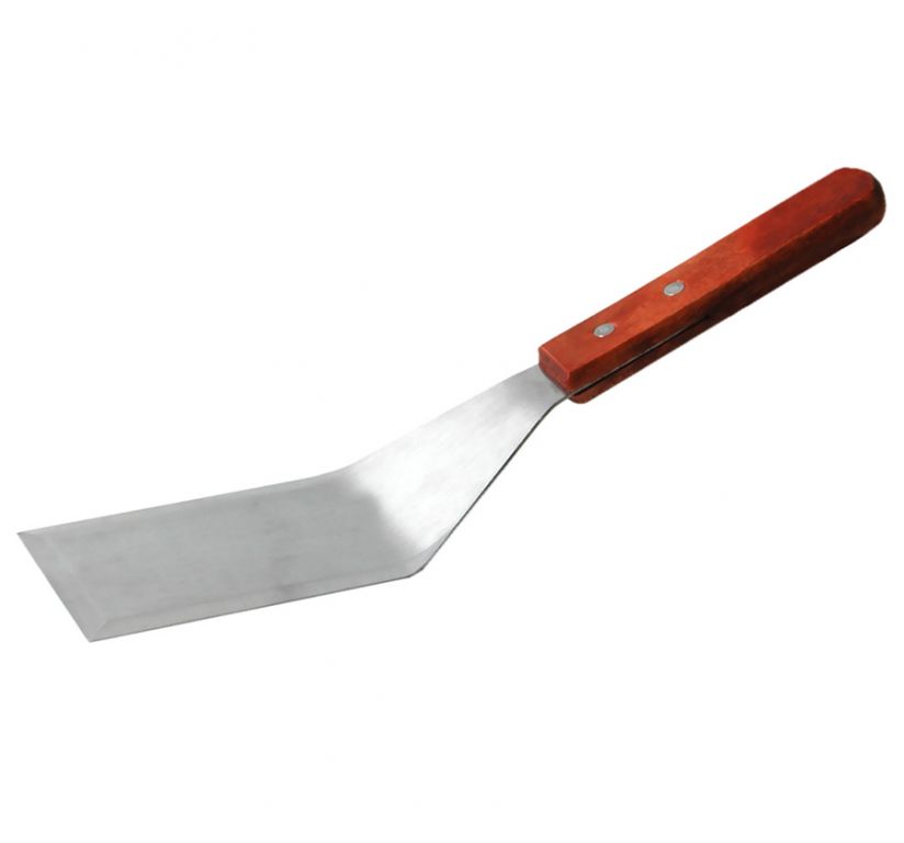 Rozsdamentes acélból készült fordítólapát, fa nyéllel 7X30 cm, sütőfelületen készülő ételek megfordítására használt konyhai eszköz.