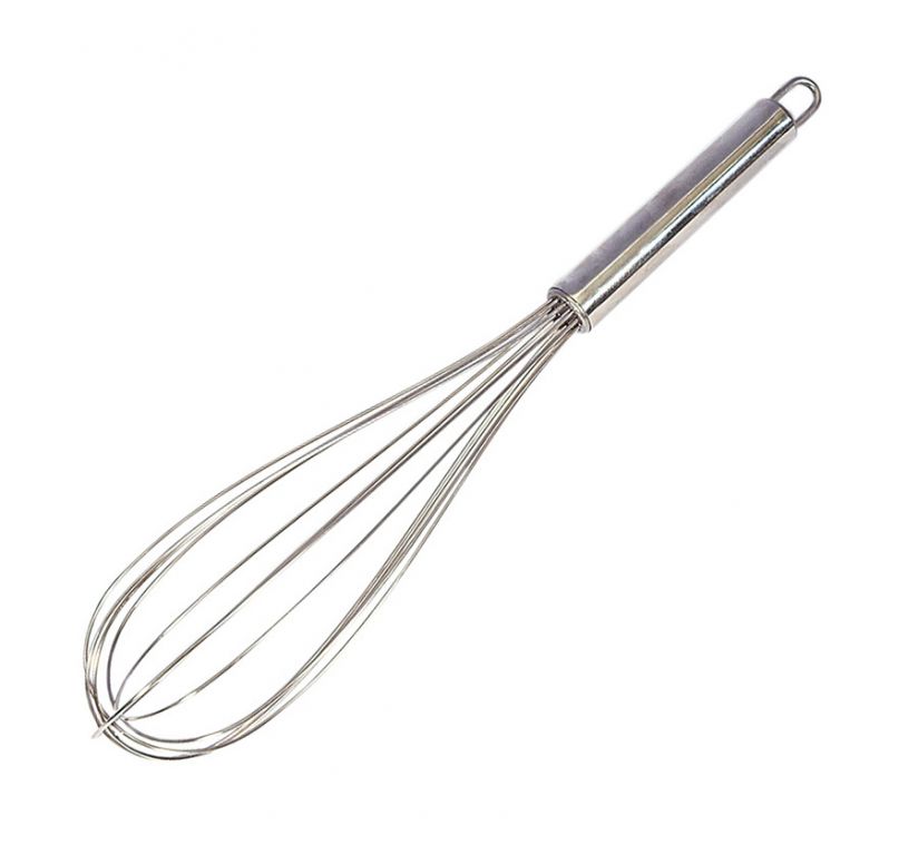 Rozsdamentes acélból készült cukrászati kellék (habverő), krémekhez, habokhoz, 12 szálas, 50 cm. Felakasztható.