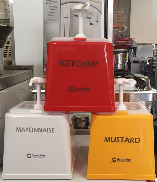 2,5L-es pumpás adagoló, szószok, öntetek tárolására és adagolására alkalmas eszköz. Egy GN 1/6 polikarbonát edényből, egy tartó állványból, és egy pumpából áll. Az állvány magassága 21 cm, mélysége 22 cm, szélessége 20 cm. A pumpa magassága összeszerelt állapotban 9 cm. Mosogatógépben mosható, mikrózható.