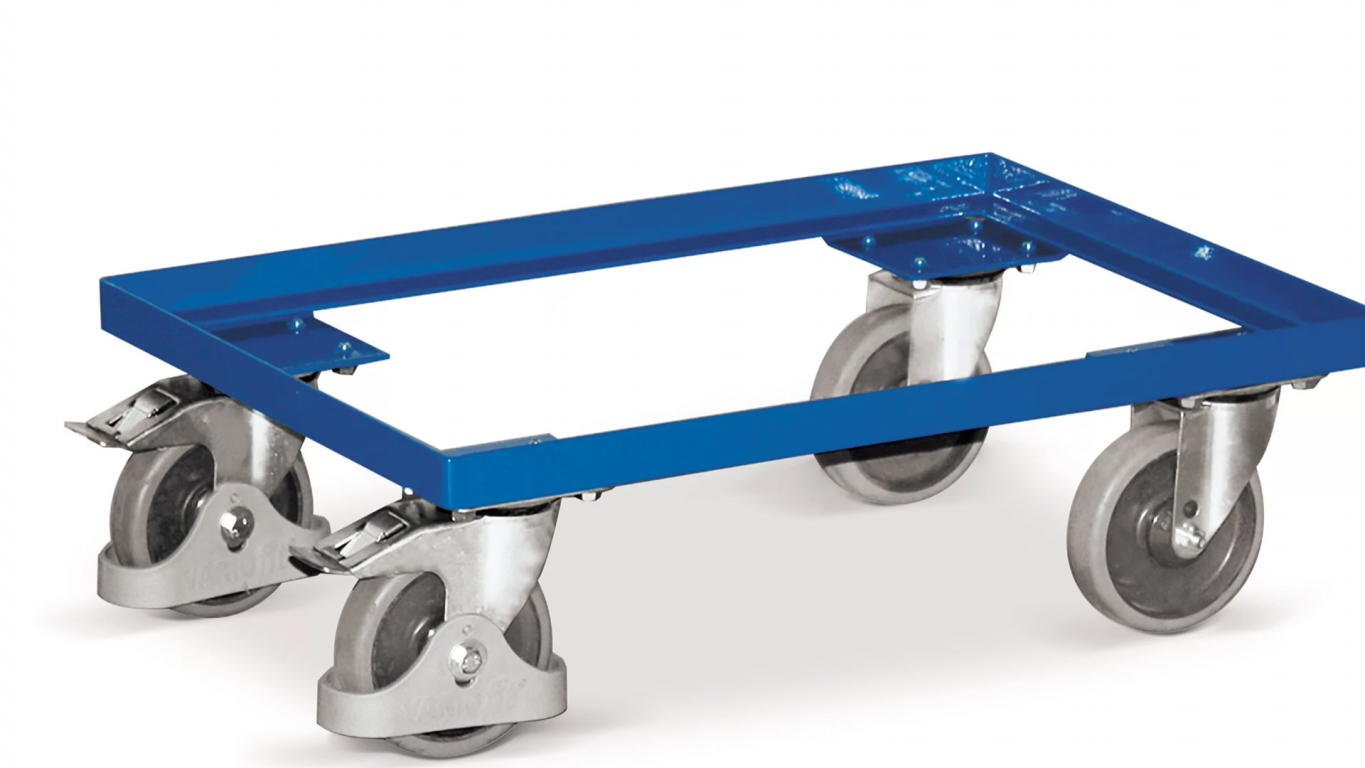 Európai szabványú doboz- és tárolóméretekhez igazítva (600 x 400 mm). Masszív és tartós: a keret acélcsövekből készült, porfestéssel bevonva, kék színű. Kapacitás 250 kg. Könnyen használható: 4 forgó kerék fedéllel és fékkel. Szürke színű, hőre lágyuló gumiból készült futófelületek, nem hagy nyomot, precíziós golyóscsapágyakkal felszerelve.